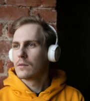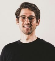 A metallic robotic hand and a human hand point towards each other at the center. Between them, there is a stylized, crystal-like representation of the letters 'AI'. The background is a gradient of orange shades.